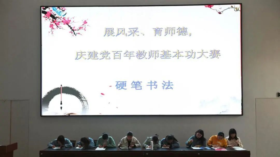 在比賽中,各參賽教師盡展風(fēng)采、各顯神通。教師們的普通話朗讀紛紛圍繞建黨百年華誕主題展開(kāi),“有一首歌,在脈管里流淌,在心里頭銘刻,這首歌的名字叫做——沒(méi)有共產(chǎn)黨就沒(méi)有新中國(guó)”,在主持人馮曉雨的介紹下,7名老師齊聲朗誦《有一首歌》,聲情并茂,感人至深;書(shū)寫(xiě)的硬筆書(shū)法則是筆走龍蛇,直而不顫,弧而不弱;說(shuō)課則是將德育目標(biāo)貫穿始終,繪聲繪色,突出創(chuàng)新式課堂。